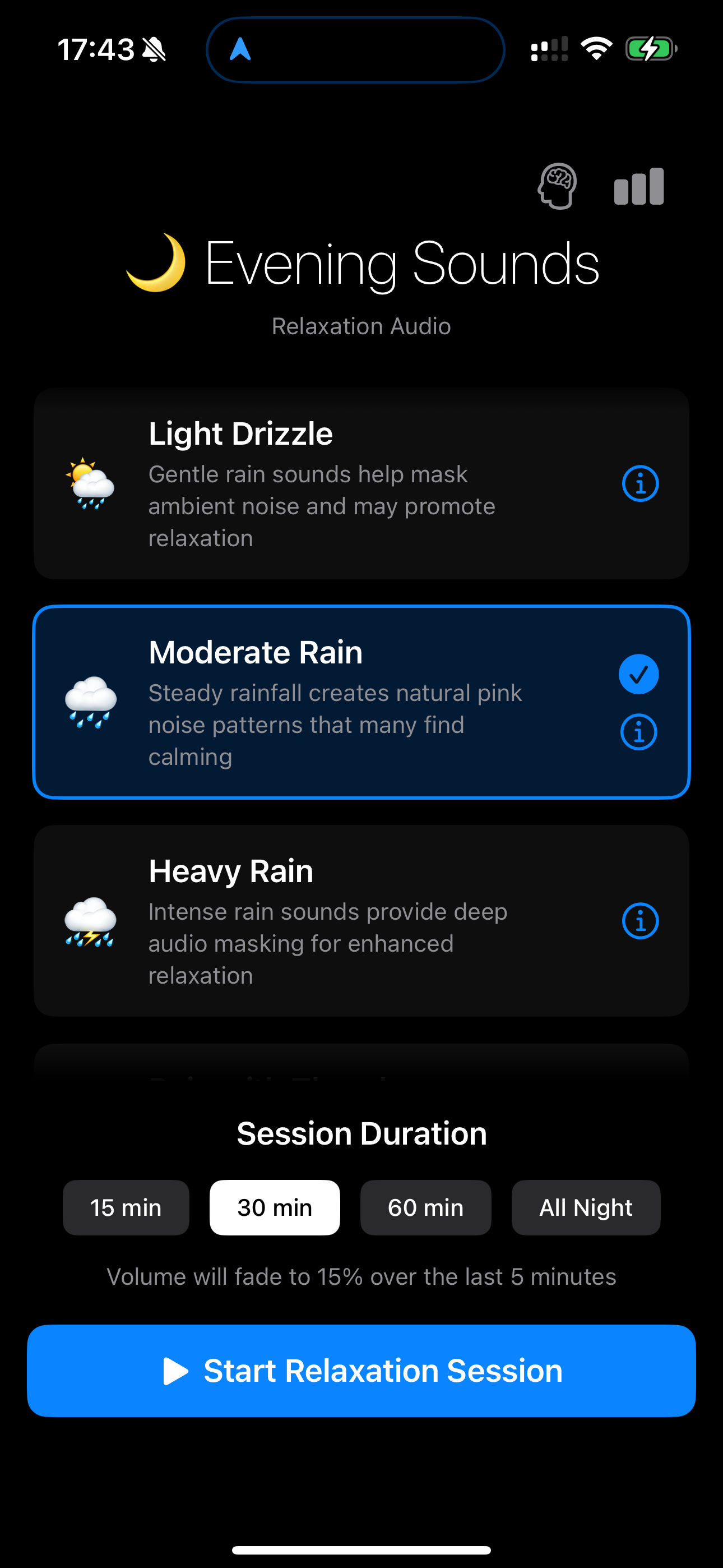 Clean interface designed for nighttime use. Just select your sound, set the volume, and let Evening Sounds guide you to peaceful rest.